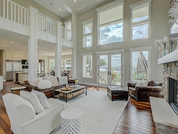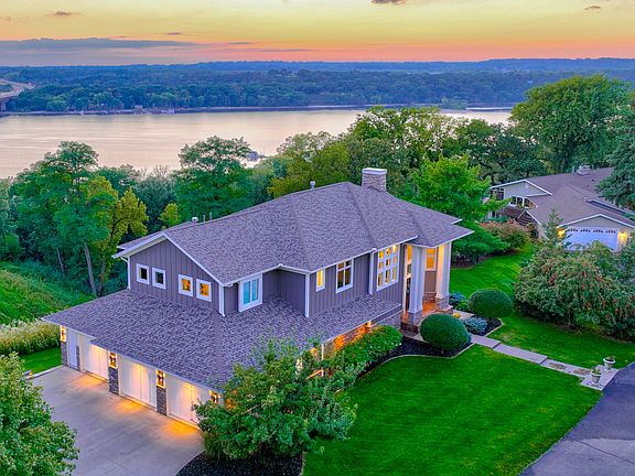 This extraordinary estate combines timeless elegance with modern luxury, offering an unmatched lifestyle overlooking the breathtaking St. Croix River. With over 6,000 square feet of living space, every detail has been thoughtfully curated with designer fixtures, finishes, and architectural features that exude sophistication and refinement. Step inside to soaring ceilings, rich hardwood floors, and walls of massive windows that bathe the home in natural light while framing sweeping western-facing river views from nearly every angle. The dramatic two-story great room is the heart of the home, showcasing a striking stone fireplace, coffered ceilings, and an open balcony overlook to the second level. Whole-home audio wiring with a Sonos system enhances every living space with effortless ambiance, perfect for entertaining or relaxing. French doors lead to a spacious composite deck, perfect for outdoor entertaining against the backdrop of the river. The gourmet kitchen is both expansive and elegant, anchored by a grand center island featuring granite countertops. Professional-grade appliances, including a Sub Zero fridge & Wolf range, elevate the space while the sleek tile backsplash, coffee bar with drink fridge, walk-in pantry, and adjacent dining area enhance both everyday living and effortless entertaining. Off the kitchen, a four-season porch with its own stone fireplace offers a cozy retreat with year-round views. The primary suite is a private sanctuary adorned with a tray ceiling, cozy fireplace, and a private deck showcasing sweeping river views. The spa-inspired primary bath features a luxurious soaking tub, a walk-in steam shower, dual granite vanities, and dual walk-in closets with custom built-ins. A dedicated laundry room with cabinets and sink adds everyday convenience. The finished walkout lower level is designed for entertaining, complete with a beautiful kitchen and bar, a luxe wine cellar, sleek stone fireplace, and expansive windows. From here, step out to the covered patio and embrace seamless indoor-outdoor living with panoramic river and sunset views, complete with a relaxing hot tub perfectly positioned to take in the scenery. This level also includes a hobby/craft room, a huge recreation area perfect for a gym, additional bedrooms, and abundant storage. Beyond the home, the exterior was freshly repainted last year, highlighting the property’s excellent curb appeal and the immaculate landscaping that frames the grounds. Geothermal heating ensures energy-efficient comfort year-round, perfectly complementing the home’s modern amenities and luxurious finishes. The oversized four-car garage features a Spancrete design with heated epoxy floors, and a mirrored tuck-under storage below (nearly 500 sqft), offering exceptional space for vehicles, recreational equipment, and more. Situated in an inviting neighborhood, this property boasts an unrivaled location just moments from downtown Hudson, the marina, and I-94. Enjoy the convenience of in-town living with scenic St. Croix River views and close proximity to restaurants, shops, and parks—all within walking distance. This is more than a home—it’s a lifestyle defined by elegance, comfort, and unparalleled river views. Don’t miss this incredible opportunity.