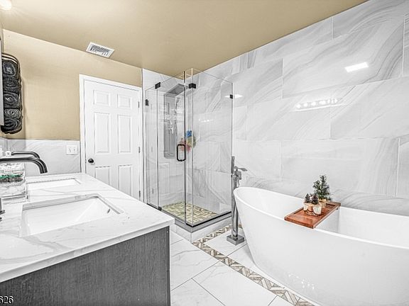 Double sinksLuxurious separate showerFreestanding soaking tubWood-burning stoveCenter islandNewly redesigned kitchenWaterfall rain-shower system
