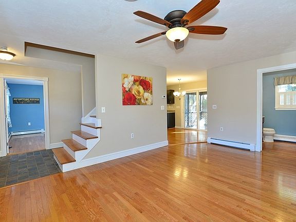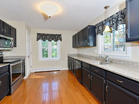 Beautifully updated Gambrel Colonial in popular Milford neighborhood location. Updates include new windows, vinyl siding, stone façade, new heating system, roof, updated kitchen, baths and entrance way. Oversized, cabinet packed kitchen with hardwood floors, dining area and sliders that open to screened in porch overlooking private and wooded backyard. Living room with brick fireplace with wood stove insert, hardwood floors throughout, formal dining room with French doors which can easily be used as home office or family room. Three large bedrooms all with hardwood floors. The walkout finished basement has a convenient side door entrance and is a perfect bonus living area. Minutes to routes 495, Mass turnpike and the Franklin Forge Park commuter rail.