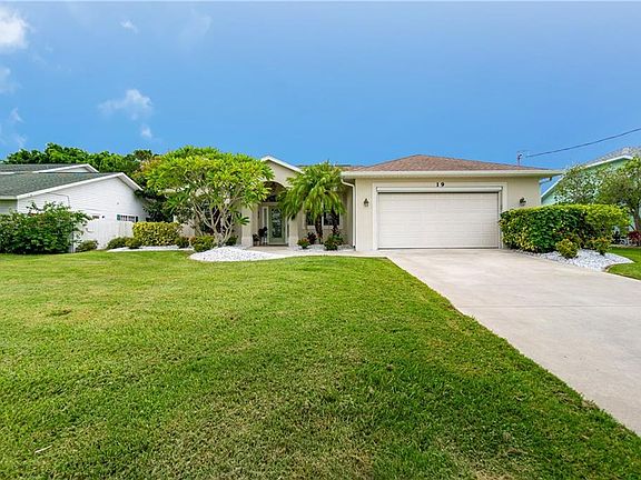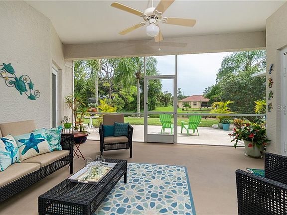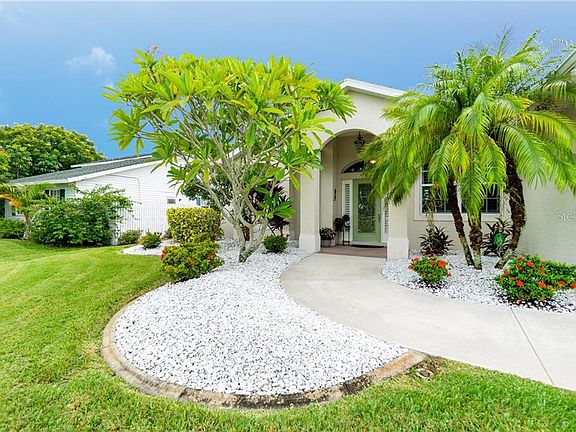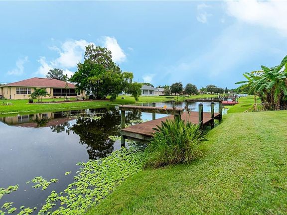 This classically Florida waterfront home is the definition of amazing! The perfectly manicured lawn, tropical landscaping, multi-dimensional roof, and columns at the grand entrance are just the beginning. As you step past the beautiful leaded glass front door framed with sidelights and a transom palladium window, you will think you are in a model. The plantation shutters, designer lighting and ceiling fans, crown molding, and attractive tile flooring are just a few of the infinite upgrades that immediately catch your eye. The wide canal takes center stage through the Great Room sliding glass doors, just beyond your screened lanai, patio, and large composite dock. The palladium and large windows and glass doors offer beautiful views from almost every room and provide an energizing flow of natural light throughout the day with the coveted Southern rear exposure. The high and tray ceilings create even more volume in this spacious home, and the split floor plan gives you privacy from guests who will not want to go home. The large kitchen features a glass front cabinet, crisp white raised panel cabinets, a closet pantry, gleaming granite look counters, a breakfast bar, and it opens to the breakfast nook and Great Room, ideal for entertaining. Have breakfast in bed while you enjoy lanai and water views as you plan your day. Should you go to a local beach, golf in one of the 5 premier courses in the community, fish from your dock, or explore the canals in your kayak? In the evenings, grill on the patio, have dinner in the dining room, join your neighbors at one of the nearby clubhouses for drinks, or sit on your peaceful dock enjoying the sights and sounds of Mother Nature that only waterfront living can provide. The 2015 HVAC system and PGT hurricane impact windows provide peace of mind, and there may just be room to put in your very own pool; the county can tell you for sure! If you decide to purchase the coastal and very reasonably priced furniture, all you need to do is park your flip flops and start living your dream on the water! Call today, this will not last!