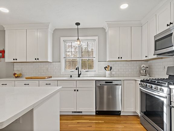 Step into timeless charm with this beautifully crafted Colonial offering over 2,400 sq. ft. of character and comfort. The open-concept first floor features hardwoods throughout, a warm family room with fireplace, formal dining, updated kitchen with center island, cozy den, and a half bath with laundry hookups. Upstairs you'll find 3–4 spacious bedrooms with oversized closets, including a primary suite with gleaming hardwoods, walk-in closet, and stunning en-suite bath with custom tile shower. One additional room offers flexibility as an office or guest space. Detailed woodwork and thoughtful carpentry create a custom feel. The walk-out basement adds potential living space, plus an outside shed for storage. Enjoy a newly paved driveway, well-kept yard, and solar panels for year-round energy savings. 100% move-in ready and recently renovated—schedule your showing today!