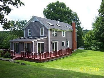 Beautiful Pastoral Setting w/ garden and an orchard plus conservation land nearby. Spacious and bright, the potential in this home is HUGE! .Eat-in kitchen w/ French doors to a heated Sunroom as well as atrium doors to wrap-around deck. Wonderful large D/R w/ hardwood floors - perfect for holiday entertaining. Living room w/ hardwood floors and wood burning fireplace. Hardwood stairs to 2nd floor w/ all new carpeting! Bedrooms & baths w/ soaring vaulted ceilings. Huge Master B/R w/ full bath. Master has walk-in closet, 3 skylites, vaulted ceiling and many windows. Bath has vaulted ceiling, skylite, shower stall and separate whirlpool tub ( not functioning) w/ tile surround. Two more bedrooms w/ vaulted ceilings & skylites. Family Bath has tub w/ shower & tile surround, vaulted ceiling. Wash/dry hook-up in 2nd floor hallway. Modifications/improvements over the years were made but unable to locate permits for same. See attached easement plan. Access to hwy , goods & services.