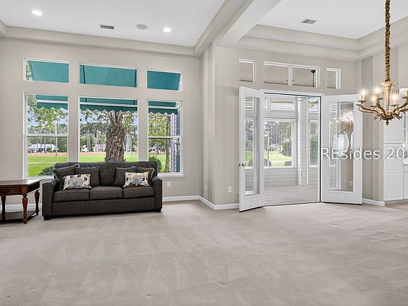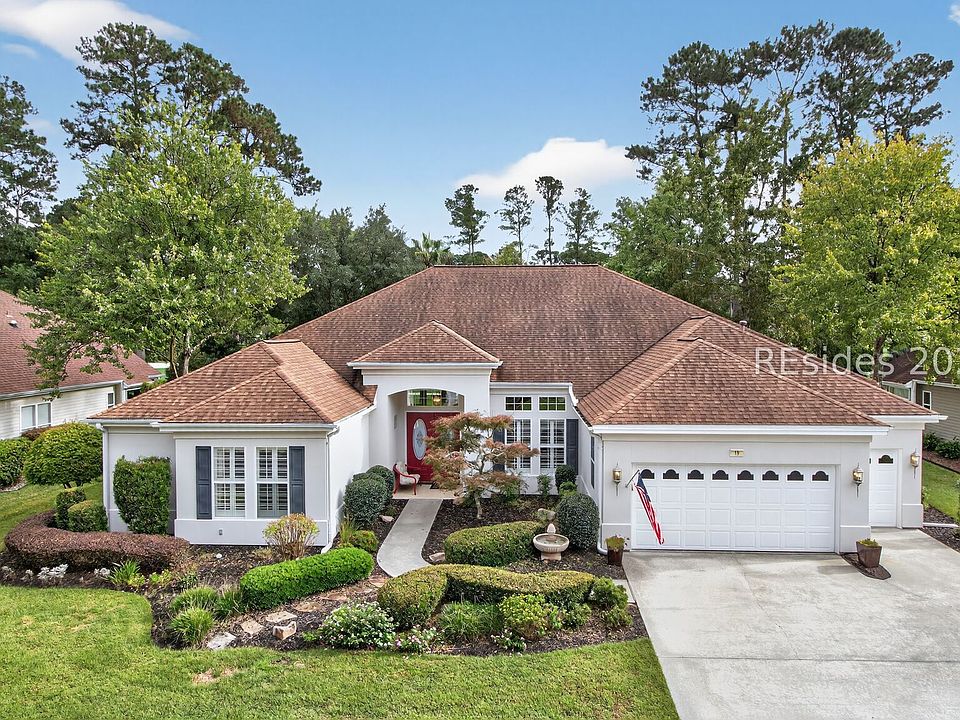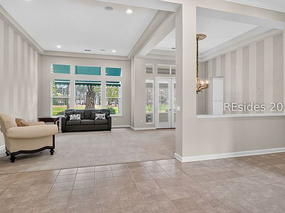 Fall in love with this coveted, Del Webb Marian Webster Estate model featuring 10 and 12 ceilings located on the Okatie Creek Golf Course. Welcome home to your Lowcountry retreat in the premier 55+ community of Sun City Hilton Head. Enjoy magnificent golf course views from your backyard in this elegantly appointed residence. The open and airy layout features a large gracious foyer, private office, half bath for guests, crown molding, plantation shutters, bay windows, tray ceilings, massive laundry room with an abundance of cabinets and counter space. There is a huge primary bedroom and bathroom with a custom closet. There is also a guest bedroom with an ensuite and walk-in closet. Entertain guests in the formal living and dining areas or relax by the gas fireplace in the inviting family room with gleaming wood floors. The spacious kitchen is a chef's delight with stainless-steel appliances. A two-car garage provides ample parking, with an attached golf cart garage! In addition, there is a large Carolina room that leads out to the patio overlooking the golf course. This home has two bedrooms, two and a half baths and is 3113 square feet. You will love entertaining your friends and family in this beautiful home.
