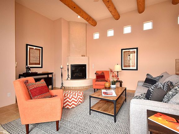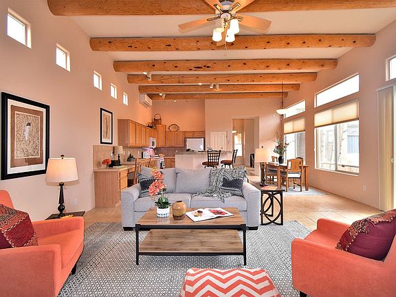 First time on the market in Rancho Viejo. Ristra model with 3 beds, 2 baths, formal living and dining plus eat-in kitchen and family room with vigas and a kiva fireplace. Private courtyard off the family room for entertaining or quiet evenings. Ductless units have replaced evaporative coolers so A/C is throughout the house. Tiled floors with carpet in the bedrooms and living room. View of Sandia Peak from master bedroom. Parapets repaired in 2017,water heater replaced in 2017, drip system operates off a cistern, security system installed. Low traffic street, just one house from Sunset Mesa.