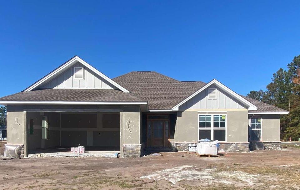 This beautiful 4 bedroom, 2 1/2 bathroom stucco home has board and batten at the front gables. It also has a double garage with opener, 2 remotes, stone foundation finish at the front and gutters at front porch. This house has 30 year architectural shingles. The foyer and great room have 10' ceilings with 9'ceilings throughout the remainder of the house. This home is complete with custom recessed panel painted cabinets in the bathroom, kitchen, and laundry room with under-cabinet lighting in the kitchen. There are beautiful solid surface countertops in the kitchen and bathrooms. The main bathroom is complete with a garden tub and separate tile shower with glass enclosure. The kitchen, dining room, foyer, great room and main bedroom are finished with 4 5/8" crown molding. Ceiling fans are located in the great room, bedrooms, and on the back porch. Carriage lamps and carriage style garage door trim are included. There is a front porch, rear porch, and a grilling pad. This home includes irrigation water system. The cost of water for irrigation is $27.50 for up to 10,000 gallons per month with an additional charge for each additional 1, 000 gallons.