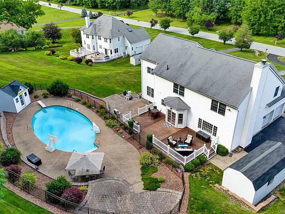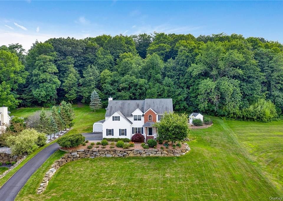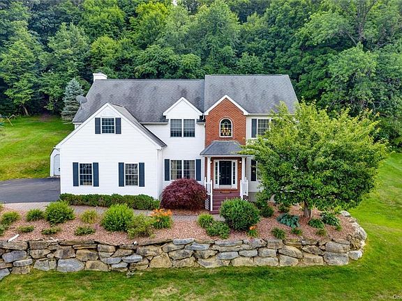 This stately and meticulously maintained Sawyer s Peak Estates Colonial home offers a spacious design with sweeping lawn and wooded private backyard. Greeted by a large foyer entrance, this home offers a formal living room, dining room, home office, family room with wood-burning fireplace, powder room, kitchen with granite counters and stainless steel appliances, breakfast room along with sliding doors that bring you to your backyard. Outside you will find a heated inground pool, cabana shed, terraced walls, Brazilian hardwood deck and patio for summer dining inspiring a fun-living lifestyle overlooking backyard woods for privacy and serenity. Master bedroom with tray ceiling, walk-in closet and en suite, 3 additional bedrooms, full bath and large bonus room with vaulted ceiling and closets to be used as desired complete the 2nd floor. Full basement with walk-out offers additional living space, storage, flex space, laundry, and full bath. Additional features include: invisible dog fence, shed, new central air conditioning 2019, hardwood flooring, and chandelier lift. Convenient access to shopping, highways, transportation, Garnet Health Medical Center and within 60 minutes to NYC. Click on Video Link to view additional photos, 360 iTour, and home floor plans.