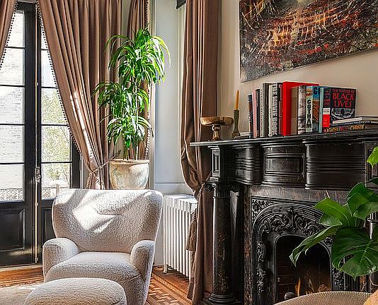 Thoughtful touches that ensure the integrity of the home for generations include a completely restored mansard roof, new ironwork fencing surrounding the home, all new, repointed brownstone, and all new interior infrastructural systems such as steel-corseted stairs.
