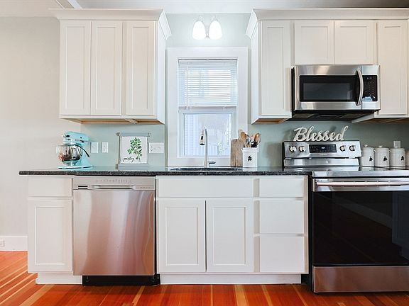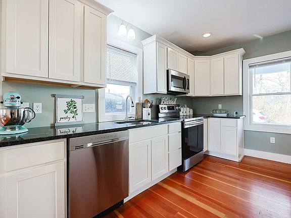 This Charming & Updated Antique Colonial boasts a spacious private backyard and an inviting front porch. The welcoming center entrance features a vintage front door that leads into a beautifully updated kitchen, complete with custom cabinets, recessed lighting, stainless steel appliances, & elegant granite countertops. A roomy dining room enhances the overall layout. The first floor also includes a bright front-to-back living room, adorned w/ additional recessed lighting, and a delightful mudroom/enclosed hallway that connects you to the expansive backyard. As you head upstairs, you'll find new hardwood flooring, stylish barn doors, & 3 generous bedrooms. The primary bedroom includes a large area currently used as a closet, which could easily be converted into an office or nursery. The updated 3/4 bathroom completes the second floor. Moreover, the home features updated 200amp electrical service, newer hot water heater and a detached one-car garage. Schedule your private showing today!