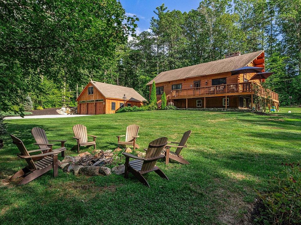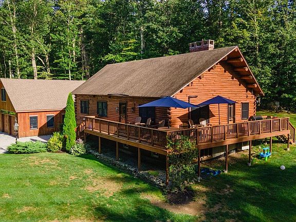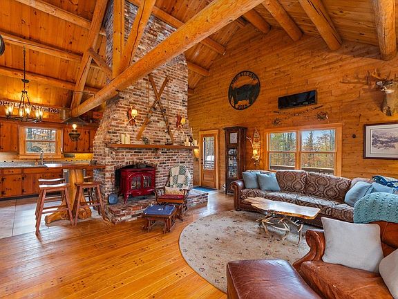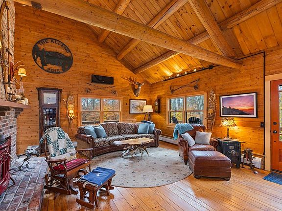 Welcome to 19 Elm Hill Road—an inviting log-style home on two private acres in the heart of Peterborough. Offering over 2,000 sq ft of living space, this warm, character-filled property features four bedrooms and two baths. The open-concept main level includes exposed beams, a vaulted ceiling, and a striking brick chimney and fireplace with a propane stove anchors the living area. The spacious kitchen provides ample workspace and flows easily into the dining area for entertaining. Three bedrooms and a full bath complete the first floor. Upstairs, the loft bedroom serves as a private hideaway with a ¾ bath and dressing area. The lower level adds more living space with a large recreation room featuring a stone hearth and woodstove, plus laundry, utilities, and an attached one-car garage with workshop area. Enjoy coffee or evening sunsets on the deck overlooking a landscaped yard and gardens framed by trees for privacy. A detached three-car garage provides excellent storage or hobby space, with potential for a home office above. Built in 1965 and lovingly cared for by only two owners, this home blends timeless craftsmanship with comfort and versatility. Just minutes from downtown Peterborough, yet peaceful and private, it perfectly balances country charm and convenience.