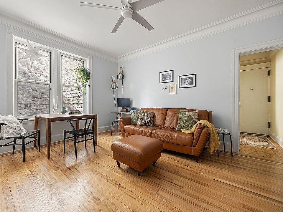 The charming apartment features a contemporary windowed kitchen, spacious living room with room for dining and workspace area, and an airy bedroom that accommodates a queen-size bed. Hardwood floors and high ceilings enhance the welcoming interior, complemented by a windowed bathroom.