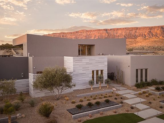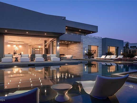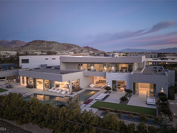 Incredible, modern home in highly desirable Azure neighborhood of The Ridges. Situated on a huge, near-acre lot w/utmost privacy & amazing mountain views, this home has style, finish and build qualities that are second to none. Fantastic floor plan with dual primary suites-one up, one down. Both suites have gorgeous spa-quality baths & spectacular walk-in closets. The chef’s dream kitchen is loaded with Wolf & Sub-Zero appliances, double islands, breakfast counter, walk-in pantry. Multiple pocketing doors create ultimate indoor/outdoor vibe and lead to oasis-like backyard. Enormous pool, chic cabana, full outdoor kitchen & putting green transform the yard into the ultimate private resort. Great room features a showcase wine cellar & large bar—perfect for entertaining. Upstairs game room converts into movie theater. Large driveway secured w/powered gate. Oversized secondary bedrooms have en suite bath & walk-in closets. Separate office. Recently updated whole-home Crestron A/V system.