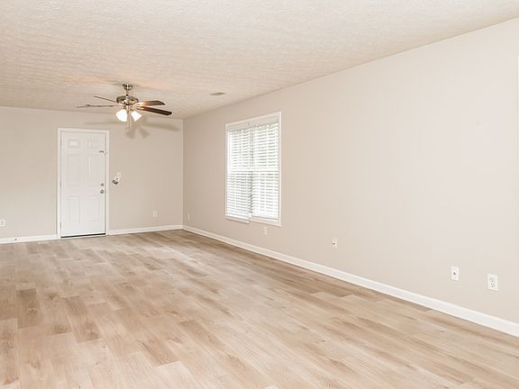 Step inside to the living room, where stunning LVP flooring, light-colored walls, and a ceiling fan create a bright and comfortable atmosphere. The kitchen, located just off the living area and overlooking the space, features crisp white cabinetry and matching stainless steel appliances, offering a clean and functional setup for everyday cooking.
