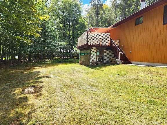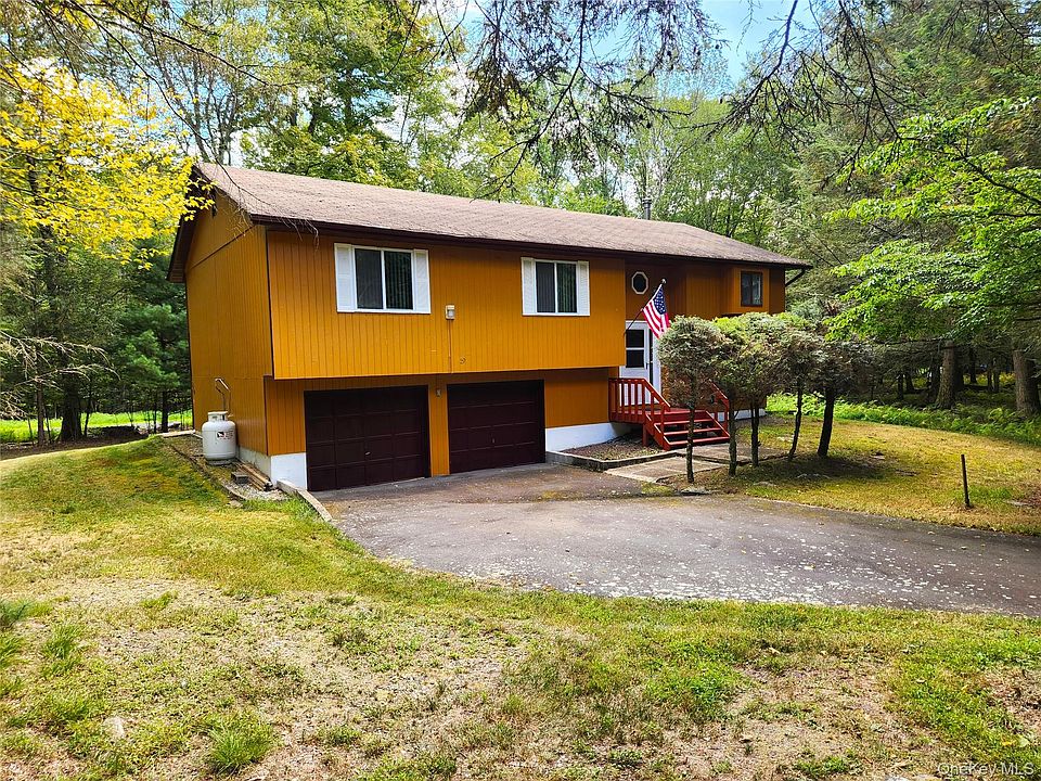Move-in ready! Four season raised ranch located in the popular town of Bethel, New York. Home of the original 1969 Woodstock Festival. Built on .69 acres in 1988, this 3 bedroom, 2 1/2 bath will check a lot of your boxes. Open floor plan merges kitchen, dining and living room space. Baseboard electric heat throughout home, wood burning fireplace in living room and wood burning stove separating kitchen and living room and freestanding propane fireplace on the end of hallway gives optional heating sources. Spacious primary bed and bath with stall shower and 2nd full bath with tub. No shortage of closet space in this home. Step out of the slider from living room to sun deck for grilling and chilling or to enjoy your morning coffee. Rollout awning gives some cool shade and hammock hookup in place for afternoon nap. Lower level has half bath, large bonus room for family/studio/art space/workout-yoga or game room. Utility room with HWH, holding tank and an older washer and dryer, not represented. Two car garage for parking, storage and lawn equipment. 200 amp service, high speed internet, drilled well and 1000 gallon concrete septic tank. Beautiful yard with cherry trees. Great space for the family cook out, firepit, games and garden. Gina Lane is a town maintained road with buried electric. Visit the Bethel dog park, walk Smallwood's Mountain Lake, visit Mini Falls park with waterfall, hike the trails at The Forest Reserve and workout on the outdoor exercise equipment. Nearby Bethel Woods for music and festivals, waterfront dining, Resort World Catskill Casino and The Kartrite Resort and Waterpark. So much to explore all year long with an abundance of mountains, lakes and rivers. Call now to take the tour!