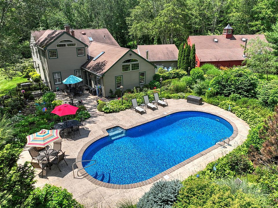 Welcome to this enchanting Roxbury home that feels like a private oasis. This stunning property sits on over 7 acres and features a heated saltwater pool, a chef's kitchen with an open concept that overlooks the great room with vault ceilings, and radiant heated floors that leads to the patio, gardens, and pool. A custom built heated 2 story post and beam barn that offers a 3-car garage was built in 2008 and also has a car lift that will be staying with the property. The wood beams throughout the home adds an extra touch of charm as you walk through. The primary bedroom features beautiful views and includes master en-suite with soaking tub. Two additional generously sized bedrooms are on the upper floor. Whether you're looking to enjoying long weekends away from the city or looking to make this a home year-round the tranquil feeling will make the world fade away.