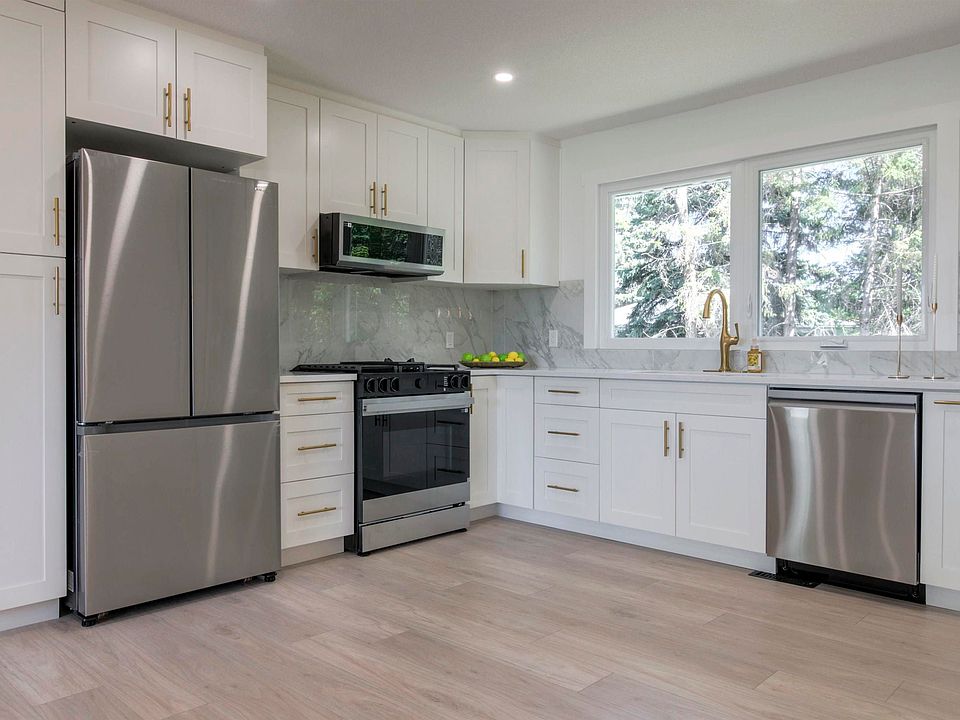 Step into this beautiful, fully finished and completely renovated over 2,000 sq ft house located in the highly desirable neighborhood of Grandin (St. Albert). The open floor plan is perfect for families, boasting a large living and dining room, kitchen with modern cabinets, tile backsplash, stainless steel appliances, gas stove and quartz countertops. A master bedroom is bright and spacious and has its own 3PC ensuite. In addition, you will also find 2 more bedrooms and 4PC main bath. The lower level is fully finished with large family/recreation room, 1 bedroom, laundry room, additional storage. Upgrades: All new windows triple pane low-E glass, all new doors, interior wood doors, main floor high end laminate. New attic insulation, serviced and cleaned furnace, pigtailed wires, new Hardie siding, soffit facia, eavestrough. All old trees and vegetation are removed and ready for your landscaping desires. School, playground, park and walking trails make this property an ideal for any family.