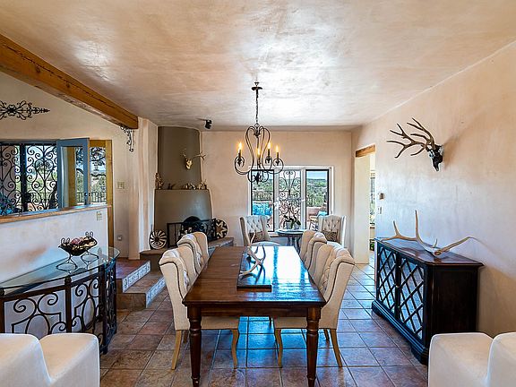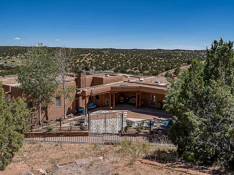12.4 acre equestrian compound in Prestigious La Tierra. Property boasts a Main home and lovely Guest house plus separate studio apartment with an abundance of special amenities and views to die for! Enjoy your very own all season heated indoor lap pool (41 x 11 1/2 ) with attendant inground jacuzzi and cedar sauna. Fully appointed Chefs Kitchen with 48in Thermador commercial range, twin ovens, 2 dishwashers and a walk in pantry. Fantastic privacy and views to enjoy. The 2 bedroom Guest casita sits atop your own ridge and offers phenomenal mountain/desert landscapes from its many Windows and fabulous deck! Wake up to views of the Sangres every morning from the guest house! Gorgeously remodeled Studio apartment next door to casita commands the best views of this state from indoors and out from own portal and deck. The 4000 sq ft plus of Main house has great flow; one large Master suite with a gorgeous master bathroom and huge rain shower and soaking tub plus second ensúite bedroom/bath. Great office with built in bookshelves and full bathroom off the kitchen. This estate boasts Santa Fe outdoor living at its finest! Multiple stone/Brick patios and portales abound! Large fenced deck off kitchen area. Attached two and a half car garage . The horse facilities include spacious horse turnouts, beautiful tack room with hot water, and Nelson automatic water heaters in each of the 3 stalls and in paddock. The fully enclosed adjacent hay barn can hold 300 bales. There is plenty of room for horse trailers and RV’s on site. Best of all you can ride off your own property on to La Tierra Trails for hours of excellent riding. This is truly a horse lovers dream facility! In a unique high desert landscape, this house is surrounded and embraced in a protected bowl-like setting that nurtures peace and tranquility whilst sheltering the property from prevailing winds. A modest fruit orchard lies to south. Property is fully enclosed by iron fencing making it perfectly safe for kids and pets. Fireplaces galore!