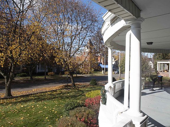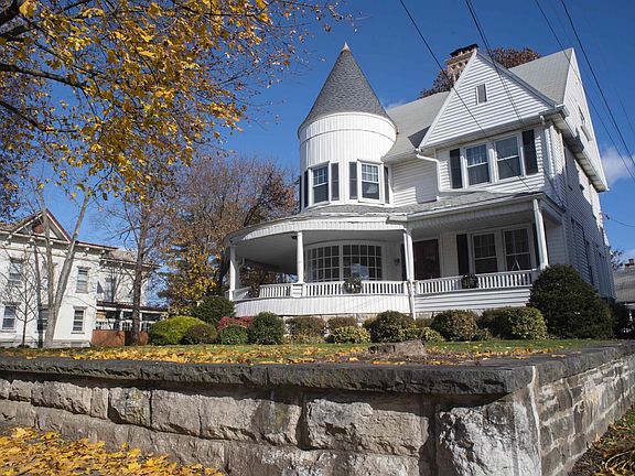 GRACIOUS QUEEN ANNE VICTORIAN in Village of Saugerties...The historic 1888 Victorian has a classic wrap-around porch with curved windows and turret, custom copper gutters, plus porch access from the kitchen door. The spacious grand Victorian home features 4 bedrooms and 2 full baths, new high efficiency mini-splits heating/air conditioning, heat pump system, hardwood floors, multiple fireplaces, well-appointed kitchen, 2-car garage, and generator hook-up/stand-by generator. Just beyond the period front doors is a large open living area with a gas fireplace and a 180-degree cushioned bench-style seating area by the curved turret windows. Tall 9-foot ceilings and large windows create a light-filled home. The Victorian grandeur is coupled with newly refinished hardwood floors, and freshly painted walls. This spacious historic home boasts tremendous versatility for living possibilities: home office, studio, library, or craft/playroom. The full-service kitchen has custom-cabinets, a new Blomberg range and exhaust, new Whirlpool refrigerator, microwave, KitchenAid dishwasher, breakfast bar and attached breakfast area. There is a formal dining room, study with built-in custom bookcase, multiple fireplaces, and a full bath on the 1st floor. The grand staircase leads to the 2nd floor landing with 4 light-filled bedrooms with hardwood floors and a full bathroom. One of the bedrooms has a fireplace and period hearth, and another bedroom is a curved turret shaped room. There are stairs that lead to the walk-up attic area on the 3rd floor. VICTORIAN & MODERN AMENITIES: multiple fireplaces, cast-iron radiators, pocket doors, Victorian plaster ceiling medallions, and detailed woodworking on the staircase showcasing the beauty and craftsmanship of the Victorian age. Off the kitchen are the stairs to the basement with the washing machine and new gas dryer. The grand home sits on a manicured raised yard with stone and brick entrance. Landscaping features mature trees, grass areas, perennial plantings, and vegetable & rose garden. The 2-car garage located on the side street has a walkway to the back door. A short walk to the shops, restaurants, cafes, boutiques, independent bookstore, movie house and conveniences of village living.