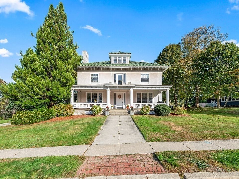 Beautifully crafted, this solid circa 1920 Federal Style home exudes charm with custom details that define the era. Original hardwood floors, intricate decorative molding, leaded glass windows, and two distinctive fireplaces. Generously sized formal dining and living rooms offer the perfect setting for entertaining. A versatile first-floor office and the light-filled sunroom seamlessly extends indoor relaxation with outdoor activities. Tastefully remodeled kitchen includes custom cherry cabinetry, Gaggenau cooktop, built-in oven, microwave, double sink and marble countertops. The built-in dining peninsula, and hutch are perfect for day-to-day use. Four generous sized bedrooms on second floor with two dual entry bathrooms from each room. Sun filled sitting area, perfect for a reading nook! Third level includes three additional bedrooms and full bathroom which has been newly updated. Stucco exterior, grand columed portico and two car garage add to the home's architectural appeal!