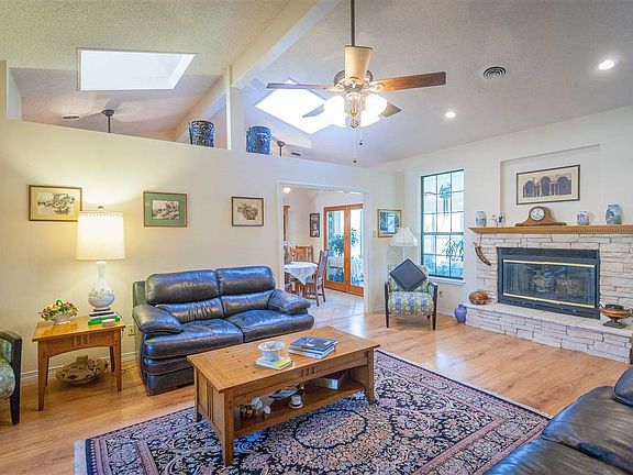 Gorgeous 3/2/2 brick home on tree lined street in popular NW neighborhood. Spacious living room w/ fireplace, laminate floors & vaulted ceiling. Sky lights thru out. Eat-in kitchen w/ breakfast bar, RO, vaulted ceiling & French doors leading to sun room. All appliances, + washer & dryer remain w/ home. Formal dining room doubles as home office. Master suite has French doors leading to lush backyard. Ensuite master bathroom w/ dbl sinks & walk-in closet. Sprinklers front & back + yard barn. New roof 2017.