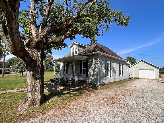 Enjoy the covered front porch of this well maintained older home. Features wide natural baseboards and woodwork, newer Pella windows, HVAC and gutters. This home could easily be a 3 bedroom.Large backyard with a 1.5 car garage. Seller says there may be hardwood under carpet.Move in ready!