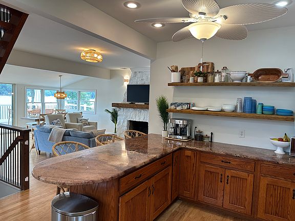Wood burning stoveCathedral ceilingRec roomTwo private docksLake front homeUpdated appliancesWrap around deck