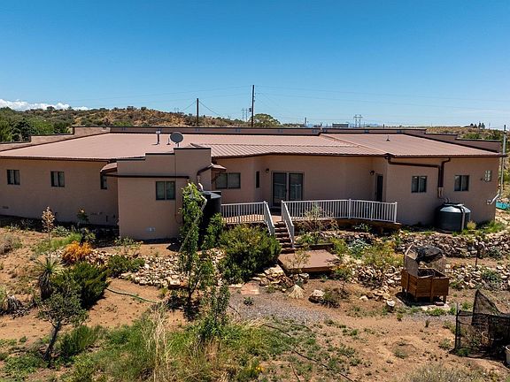 This charming 3 BD, 2 BA Southwest-style home blends rural charm with modern amenities. Filled with natural light and plenty of room to relax or entertain. Enjoy stunning views from the den and two bedrooms opening directly to the back porch. Recent upgrades include re-stuccoed exterior, Marvin windows and doors with energy-efficient honeycomb blinds, new floor tile in kitchen and halls, hardwood in 2 bedrooms. The bright kitchen includes a dining nook, Bosch 5-burner stove, stainless steel French door refrigerator, large pantry, and closet utility sink. Laundry room is separate. Gas furnace for heat, plus pellet stove in main bedroom and whole house water filtration. A crawl space beneath the entire house provides utility access. Attached garage has RV hook-up. Large, fenced backyard offers raised garden beds, hen area, fruit trees, and 1900 gallons of roof water collection in 3 tanks. Includes the adjacent lot (11.24 acres, 2 Lots!) Ask for a list of all features!