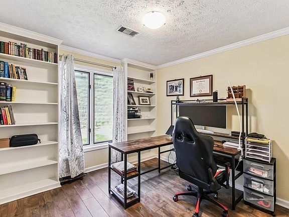 Cozy fireplaceHome officeGleaming hardwood floorsCreative studioSerene wooded viewsVersatile flex spaceBeautifully updated shower walls