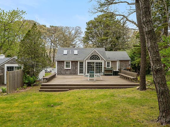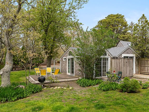Privately sited in a quiet neighborhood on Oakdale Drive, abutting Edgartown Golf Club, this property offers a bright and spacious cathedral ceiling 1-bedroom, 1.5-bath home and a charming 1-bedroom, 1-bath cottage. The location is ideal with proximity to the bike path, State Beach, and the Village. The home features an open floor plan with beamed ceilings, skylights, and sliders to an expansive deck for extended outdoor entertaining. The cottage also embraces abundant natural light, with a vaulted ceiling and 2 sets of slider doors to a private deck, patio, and outdoor shower. Being sold furnished except for some personal items, this is a rare opportunity not to be missed. The septic system did not pass the Title V inspection. Sourati Engineering Group has been engaged to design and obtain Town approvals for a three-bedroom sewerage disposal system. Seller will contribute up to $20,000 at closing to the repair/execution of the Title V compliant system.First Floor: This sun-filled home enjoys a cathedral-ceiling open floor plan. There is a spacious living room and dining room with sliders to the amazing large deck for outdoor entertaining. The kitchen is next to the dining room with a half bath beyond. There is a pocket door to the bedroom and ensuite bathroom for additional privacy. Cottage: The charming cottage is bright and fun with a cathedral ceiling and two sets of sliders that lead to a private patio in the back and a deck at the entrance. There is a bedroom, full bath, and small overflow bunkroom or office space that complete this space.