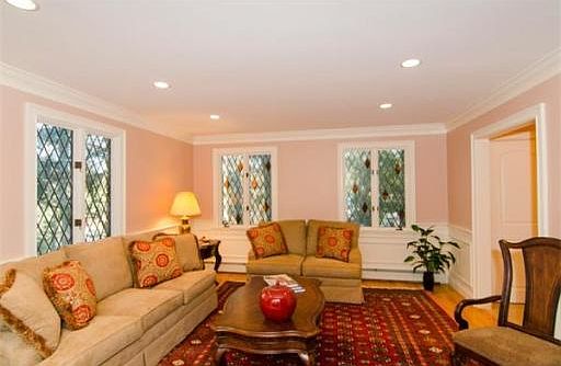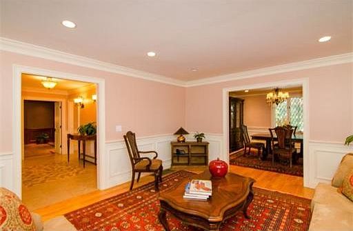 Unique estate setting w/ cobblestone private driveway. Stunning 2012-13 kitchen and baths. Library features custom cabinetry, pilasters, wainscoting, recessed lighting, maple floor w/cherry inlay and coffered ceiling. Living room is accented with crown moldings, wainscoting, and leaded casement windows. Dining room leads to custom kitchen complete with Sub-zero freezer/refrigerator, Wolf 5 burner gas cook top, granite counters, Bosch dishwasher, pendant lights and indoor grille .Beamed cathedral ceiling and large stone fireplace set the tone for complete relaxation in the spacious family room. Direct access leads to large deck w/ barbecue grille, fantastic wooded views and large fenced in area. The master bedroom is served by a marble bath, shower, 2 built in vanities and a fabulous walk-in closet. 3 additional bedrooms, a full bath w/ marble double sinks, tub and shower serve these BR's. Au-pair apt has separate entry, full bath, kitchenette, bedrm,+ sitting rm or 6th bedroom.