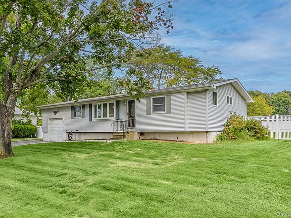 Welcome to this charming ranch-style home in the desirable Three Village area of East Setauket. This home offers 3 bedrooms and 1 full bathroom with an open-concept layout. The eat-in kitchen flows into the living room and dining area, featuring a cozy fireplace and sliding glass doors that fill the space with natural light and provide easy access to a beautifully fenced backyard — ideal for entertaining or simply relaxing outdoors. Additional highlights include a one-car attached garage, natural gas heating, and an unfinished basement that provides ample storage space or future potential for customization. The gated backyard offers added privacy, making it a great space for families, pets, or outdoor gatherings.