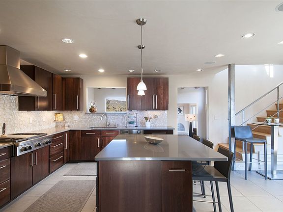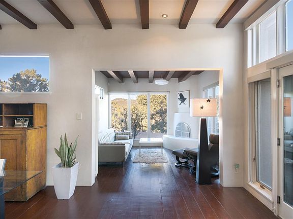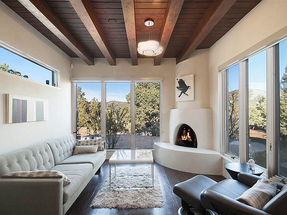 Sleek, sophisticated clean contemporary Santa Fe home on 4.6 acres of privacy and views! Features include a dazzling kitchen with stainless steel appliances, new Zodiac countertops, Wolf gas range, and a large walk in pantry with sink. There are three bedrooms, one full bath and one half bath. The inviting living room has a kiva fireplace and harmonious views. There is a dining room plus a media room/den with a SONOS Sound System (indoors and outdoors) The large master bedroom has a fireplace and a deck with spectacular views - great bird watching, and views of mountains and skyscapes, from sunrise to moonrise. An underground electrical service insures unobstructed views. The spa like master bath has instant hot water. Lutron Electronics System throughout the house, and Q Motion shades throughout. There is ample storage and closets, and two storage sheds. Home has an alarm system and security cameras. Enjoy premium baseboard heating with 7 individual heating zones; and cooling with 2 Evaporative Coolers and ceiling fans. Invite your friends at night to sit around the outdoor fire pit. The owners installed new gutters and rain barrels; new steel awnings, and new contemporary powder-coated steel gates. This can be an equestrian estate. The 4.6 acres are tended and clean with no deadwood, and completely walkable. This property is close to everything - bike trails, the Hospital, Harry's Roadside Café! It is in the coveted Wood Gormley School district.