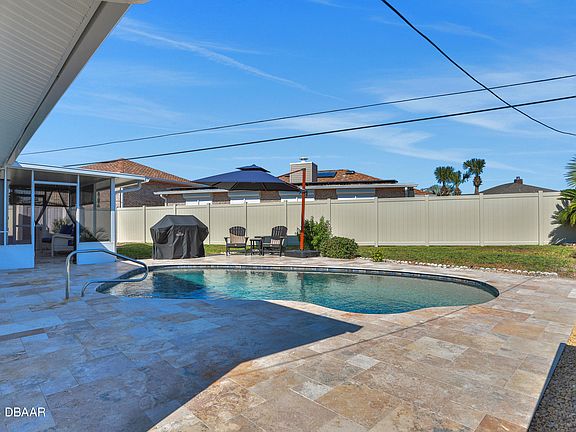 Welcome to your own beachside paradise in this charming 2-bedroom, 2 full bath Ormond By-The-Sea pool home. Recently renovated in 2023 with many upgrades! Brand new wide plank flooring and baseboards, completely new kitchen with KraftMaid cabinets, stainless steel appliances, and granite countertops, new bathroom vanities and fixtures, freshly painted interior and exterior, new vinyl privacy fence and rain gutters. The highlight of this adorable home is the stunning pool with all new travertine deck, new PebbleTec interior, and new salt water system. Perfect for entertaining and enjoying your new coastal lifestyle! Located just steps away from Ormond's no-drive beach and the picturesque intercoastal waterway. The garage provides ample storage space for your beach essentials, bikes, or even a vehicle. New HVAC 2021, water heater 2015, and 2011 roof recently inspected, 3-zone irrigation system. Schedule a showing today to tour this delightful beachside gem!
