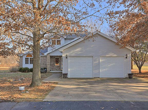 Beautiful inside and out! This waterfront 1.5 story home is situated on a 1.38-acre lot with many mature trees. Inside, the soaring two-story entry ushers your guests to the two-story living room with floor to ceiling windows and brick front fireplace. The spacious eat-in kitchen offers an abundance of cabinets and center island with seating. You will enjoy the first-floor master suite with dual walk-in closets, private bath with dual vanities, tub & separate shower plus your own door leading to the extensive deck. The upper level features a loft/family room overlooking the main level and two additional bedrooms connected by a full bath with dual vanities. Outside, you will enjoy the views from the oversized deck accessed by the master suite, living room, and dining room. The above ground pool will be everyone's favorite place to be this summer. There is also an extra two car detached garage which is heated, insulated with water and electric. This is a must see property!
