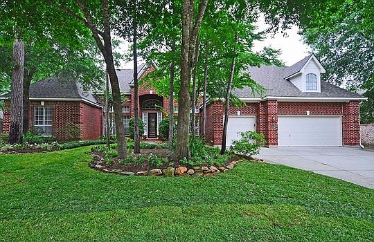 SINGLE STORY CUSTOM all brick home in the coveted neighborhood of Taylor Point. Huge(15,836 sq ft) cul-de-sac lot w/pool, plenty of green space & true 3 car garage. 4 bedrooms down, w/gameroom & 5th bedroom up. Beautiful hardwoods, tile, carpet, granite in kitchen/baths, master shower & roof are just some of the updates. Custom features include crown molding, unique ceiling features, built-ins & large closets. Perfect home for those needing 4 bedrooms down. A rare find for a Woodlands custom!