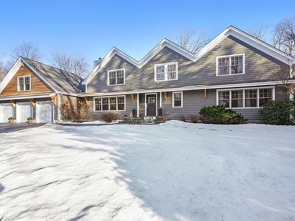 Serene Country Sophistication…Tucked along a quiet country cul-de-sac, this striking 4,060 SF home blends timeless craftsmanship with modern luxury. The two-toned cedar exterior sets the tone for refined country living. Inside, an inviting open-concept layout centers around a floor-to-ceiling stone fireplace, showcasing rich millwork, solid wood doors, wide-board oak floors, and elegant French doors. Remodeled in 2020, the chef’s kitchen is a true showpiece; granite counters, Wolf range, and Sub-Zero refrigerator with two islands flowing seamlessly into the dining area, living room, and family room. Step through French doors to an expansive Trex deck and stone patio featuring a magnificent stone fireplace and outdoor pizza oven—an entertainer’s dream. Thoughtful landscape lighting casts a soft evening glow, creating a magical ambiance for al fresco dining, festive gatherings under the stars, or quiet moments surrounded by lush, private grounds and a fully fenced yard. This outdoor oasis is completed by a heated Gunite pool (installed in 2018), framed by professional landscaping and accent lighting for year-round beauty. The first-floor primary suite is a private retreat with two walk-in closets and a spa-inspired bath featuring a claw-foot tub and oversized walk-in shower. Upstairs, discover two spacious bedroom en-suites with large closets and beautifully appointed baths, along with a third private en-suite bedroom accessed from the back staircase—ideal for guests or extended family. The three-car garage connects to a mudroom and laundry area, combining convenience with thoughtful design. Additional highlights include a security system, automatic Generac generator, brand-new hot water heater, and a boiler less than 10 years old. A home of exceptional comfort and craftsmanship; where every detail reflects quality, warmth, and understated elegance.