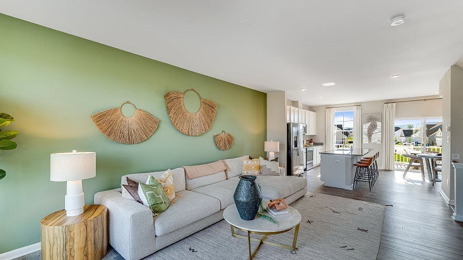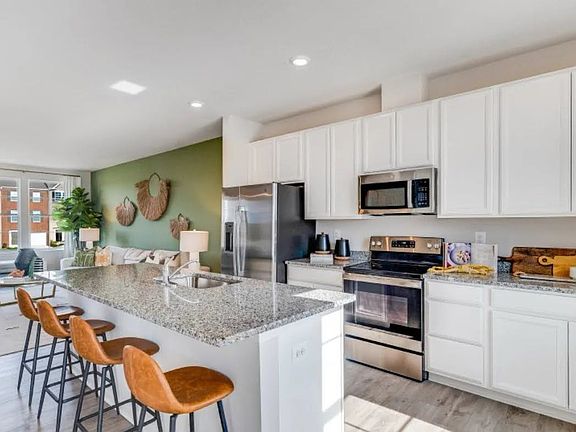 Open floor plan connects the kitchen, dining, and living areas into one bright, inviting space perfect for gatherings or cozy nights in. The kitchen is a true highlight, featuring White Ornamental granite countertops, Stone-finish cabinets, a subway-tile backsplash, and elegant pendant lighting over a large island.