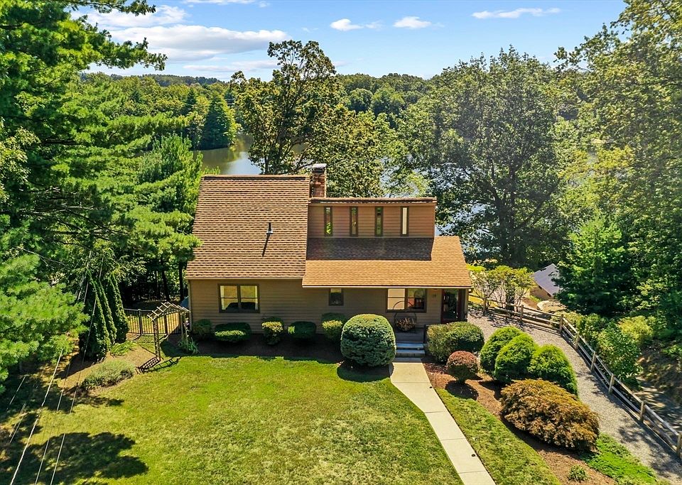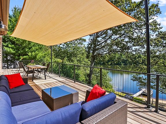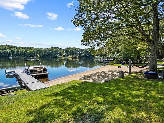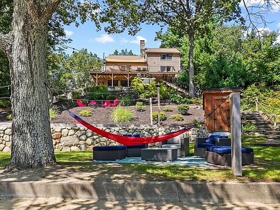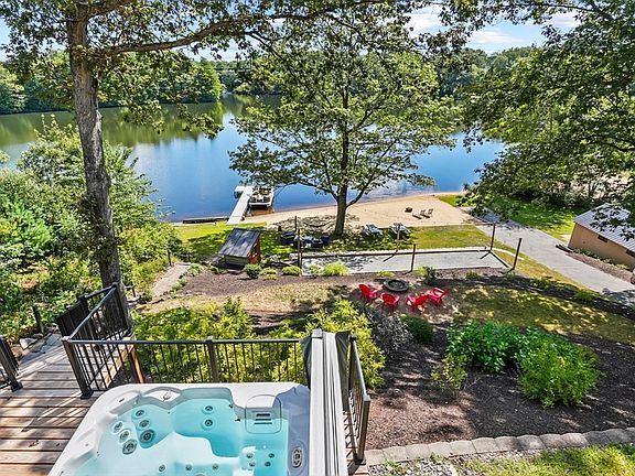 OFFER DEADLINE SET 9/30 at 3 ~ Experience waterfront living on South Meadow Pond! This spacious contemporary home offers direct pond access with your own boat dock, private beach, outdoor shower, hot tub, fire pit & a tiered yard perfect for entertaining. Inside, the expansive living room showcases water views, a vaulted beamed ceiling, floor-to-ceiling stone fireplace, & sliders to the large back deck, flowing into the open kitchen with S/S appliances, granite countertops, breakfast bar, built-in dining nook, & abundant cabinet space. A full bath, 1st floor bedroom, and an office complete the main level. The 2nd floor hosts one of 2 private primary suite options with en suite bath. The finished lower level adds a 3rd bedroom with en suite bath, a spacious bonus room with wet bar, another 1/2 bath with laundry and access to a covered patio and porch. Complete with a detached garage and ample off-street parking. Enjoy 4 seasons of beauty.