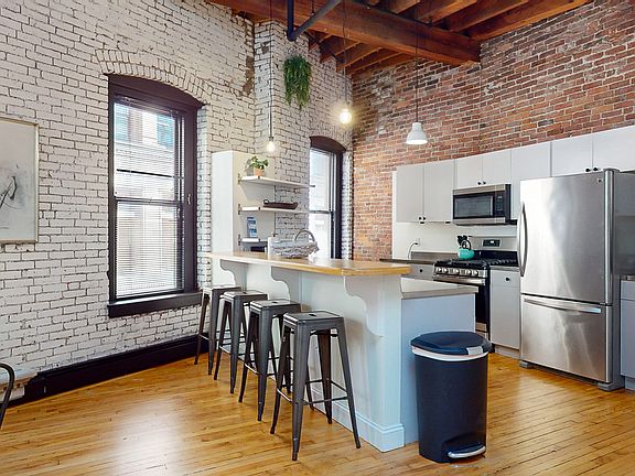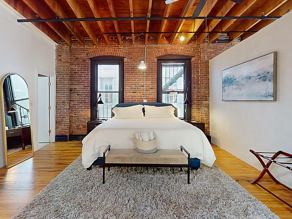 In-unit laundryExposed brickOpen-concept designHardwood floorsKing bedCamel leather sleeper sofaCorner unit