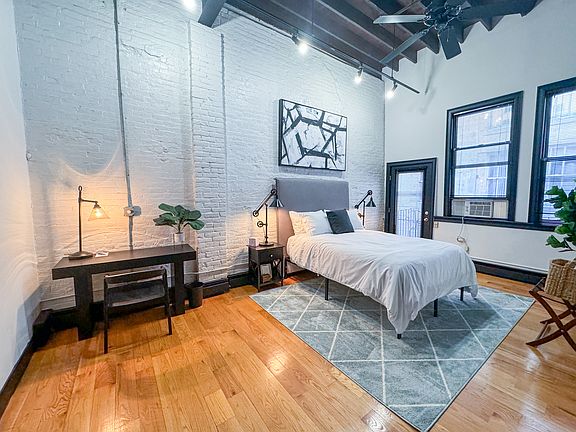 In-unit laundryExposed brickOpen-concept designAiry open layoutHardwood floorsSectional sleeper sofaLarge flat-screen tv