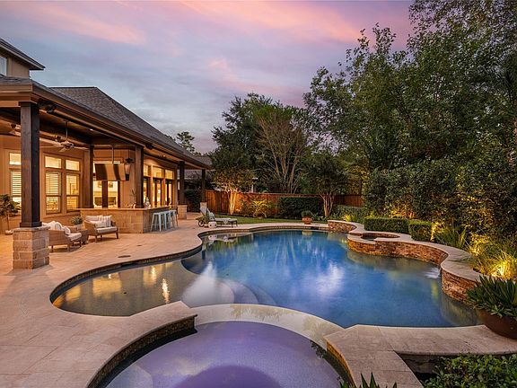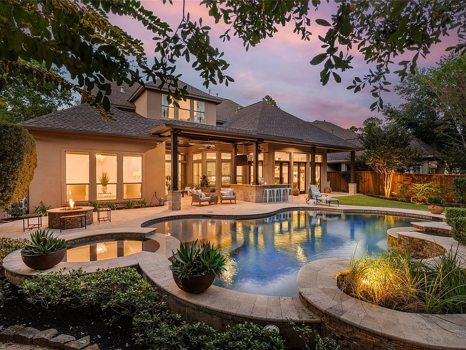 Woodlands showstopper w/stunning architectural & design quality, private backyard sanctuary with/2018 pool, spa, firepit, covered Summer Kitchen & Lanai w/remote shades & heater.Transitional interior design oozes charm & elegance. Natural light illuminates entire home in addition to custom light fixtures in each room. Soaring ceilings/walls smoothed to Grade 5 matte gleam finish. European-level craftsmanship in 2024 kitchen w/fluted panel cabinets, unlaquered gold hardware & GE Cafe refrigerator & appliances. "Texas meets California" Family room w/triple French doors extending living space outdoors. Magazine-ready Primary Suite has must-see soaking tub area & His/Hers walk-in closets. Home has a Study/Library, Formal Living, Formal Dining & Game Room. The 2nd floor features 3 fully renovated bedrooms & baths. Large MUD & utility room off garage w/Epoxy floors & guest bath. Professionally landscaped, 2025 exterior paint & full house generator. Tasteful, timeless & turn key.