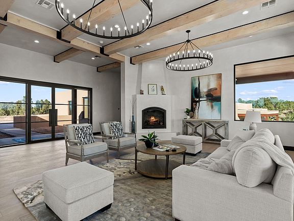 Nestled in the prestigious Las Campanas community of Santa Fe, this new custom estate blends modern architecture with New Mexican charm. 1.64-acre homesite overlooking breathtaking fairway and mountain views. Built by New Mexico's premier luxury builder, Candelaria Homes. Designed for comfort, the single-story layout features heated floors in the main living and family areas and a detached one-bedroom Casita for guests or a private studio. The gourmet kitchen boasts bold dark finishes, Sub-Zero appliances, a large island, and a butler's pantry. Bonus living space for playroom, library, or lounge. Expansive windows frame the landscape, while patios and the open-concept great room complete this masterpiece of elevated desert living.