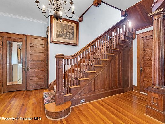 This magnificent 1911 Colonial does not disappoint! Admire the beautiful wrap around porch with carport. Once in the foyer you're taken back in time. Original Chestnut woodwork, pocket doors ,ornate fireplace and stained glass. Beautiful HW floors, open staircase,4 large Brs,3.5 Baths, walk up attic, LL have laundry. 2 car garage. landscaped, Baths: 1 Bath Lev 1,Modern,2+ Bath Lev 2,1 Half Lev 1, Beds: 2+ Bed 2nd, SqFt Fin - Main: 1741.04, SqFt Fin - 3rd: 0.00, Tax Information: Available, Formal Dining Room: Y, Modern Kitchen: Y, SqFt Fin - 2nd: 1679.62, Additional Info: Luzerne County supra on railing. AC installed on the second floor only. The Fireplace in LR has never been used by this owner. Please shut off all lights, leave fans on,. Use showingtime for appts