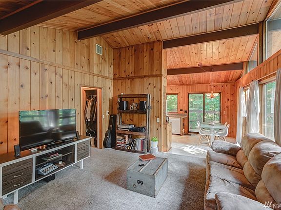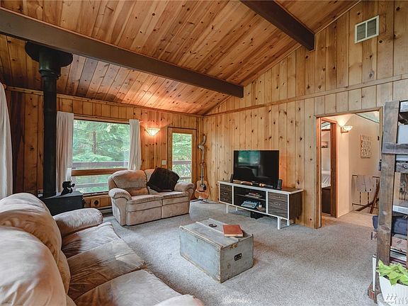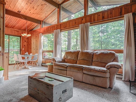 This huge cabin in the woods is a dream! There's an A frame upper level w/ huge windows, a large deck over looking the trees, 2 massive bedrooms, a bath and a large open living room & kitchen. Downstairs is a daylight basement with a 3rd large bedroom, a bonus room w/ it's own private entrance, and a utility room that could easily be made into another kitchen. The modern cedar walls in the living room along w/ the TWO fireplaces make this Sudden Valley home one of the coziest on the market!