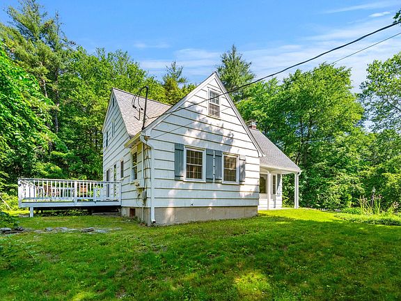 Come check out this unique opportunity for great location in Hollis! This cute, sun-lit modified Cape home (with full dormer on back) offers privacy and a flat back yard on a 2.5+ acre wooded lot in a wonderful neighborhood. You can safely walk or bicycle via dirt roads to the Town center and playing fields. Larger than it looks, the house has 3 bedrooms, 1.5 bathrooms, open-flow living room (w/ fireplace), dining room, and kitchen, plus two bonus rooms. Mostly hardwood floors throughout with new vinyl plank flooring in kitchen and half bath. Enjoy the expansive deck, fire pit and utility shed outside, and even have chickens if you want. Roof is only 2-1/2 years old, newer windows and storm doors (2018). Septic was checked & pumped and chimney has been professionally cleaned and repaired including new crown, cap, and flue liner, re-pointing, flashing and caulking (2024). New toilets, lighted medicine chest and well tank plus brand new stainless steel range. Most rooms are freshly painted. The location provides easy access to all Nashua amenities and Route 3 yet offers the rural experience of Hollis and its highly-ranked schools. It's a must see!