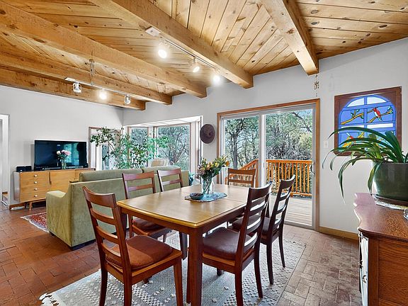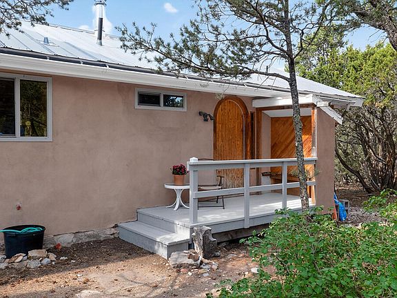 Charming mountain home on 2 acres, 2 separate lots 4&5 block 4 Sierra Encantada. Wooded, fenced and gated this 3 bedroom plus study offers mountain living among the pines. New front deck and handcrafted door lead into a sunny living/dining room with brick floors. Kitchen has lots of work space and counters. 2 bedrooms on main level with a study/office nook with wood stove. Passive solar exposure warms and brightens the home. Upstairs is primary retreat with extra space for baby or sitting and a stargazing balcony. Two baths. House is a water haul and has rainwater collection into an open tank for watering. New deck off the back perfect for enjoying the whispering pines and birds. Coops and sheds and an outbuilding too.