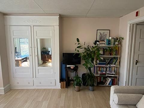 Vinyl floors, eatin kitchen. Bright living room with bay window and built in closet. This is a quite building of two houses that were converted into 6 apartments.