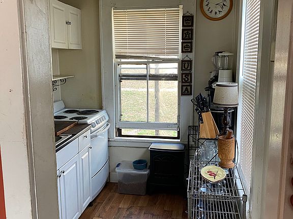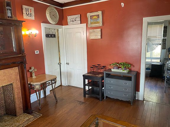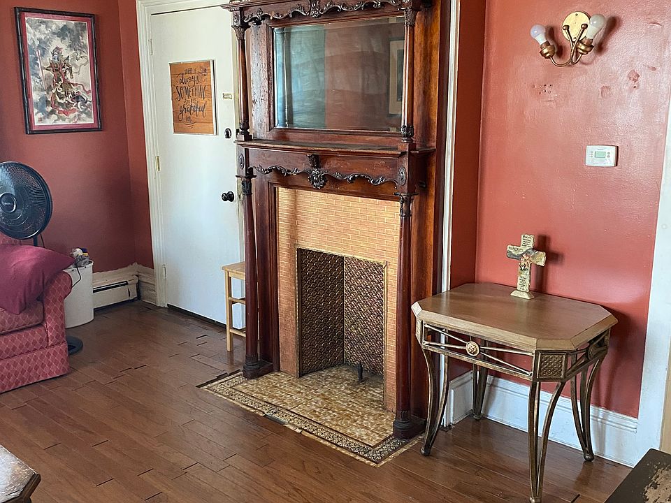 Sunny galley kitchenDecorative fireplaceHardwood floorsShared front porchLarge closetQueen size bedShared yard