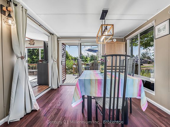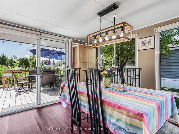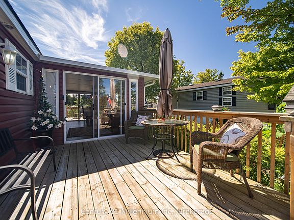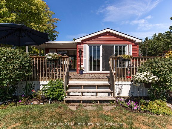 Welcome to your perfect seasonal getaway in the highly sought-after Countrylife Resort! This partially-furnished, charming 2-bedroom, 1-bathroom retreat offers everything you need for relaxing escapes or family fun by the beach. See long list of furnishings included. Upon arrival you are greeted by a large front deck with a cozy sitting area. Step inside and enjoy the spacious 19' x 9' sunroom, ideal for morning coffee or evening gatherings. Step outside to a spacious deck, offering picturesque water views. Relax and enjoy the view of the pond or take a brief walk to the beach on Georgian Bay. Enjoy modern comforts with central A/C, natural gas heat, and municipal water and sewer. The oversized yard provides plenty of space for entertaining around the fire pit, and endless manicured gardens. The 2 dedicated parking spaces add convenience for you and your guests. Countrylife Resort is known for its incredible amenities, including:5 pools for endless swimming, Pickleball & tennis courts for active living, Kids play areas, splash pad & mini golf to keep the little ones entertained, Clubhouse & social activities for the whole family and a secure, gated community for peace of mind. All this, just minutes from Wasaga Beachs shops, restaurants, library, and the new twin arenas. Whether you're looking for family fun or quiet relaxation, this seasonal retreat offers the best of both worlds in a resort-style setting. Don't miss this opportunity to own your own piece of Wasaga Beach paradise! This is designated a premium large lot and as such the anticipated seasonal site fees for 2026 will be approximately $9,250 plus HST. Don't miss this opportunity to own a carefree getaway ...just schedule your showing today!