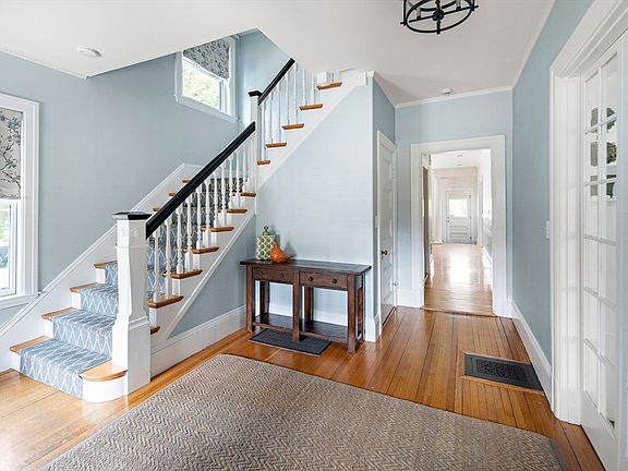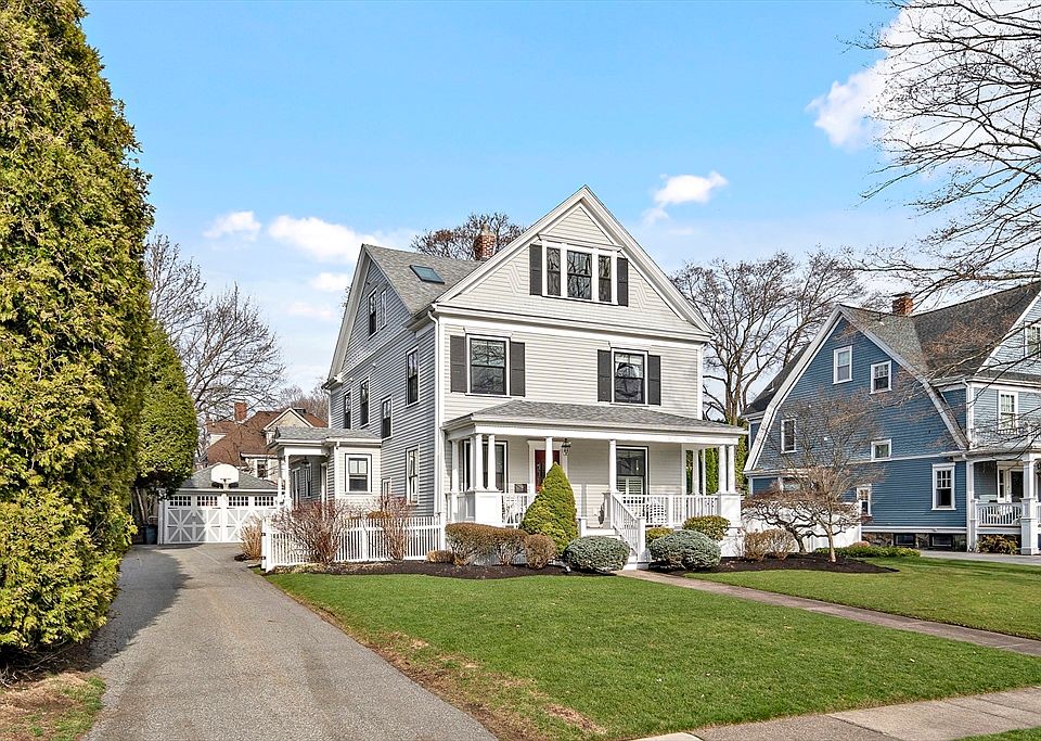Welcome to the Flats, where elegance and charm abound, the neighborhood is the one everyone aspires to. A gorgeous foyer welcomes you and flows easily into the living room and dining room, both impressively lit with natural light. A fireplace and custom built-ins add warmth and charm, beckoning for dinner parties and entertaining. A huge kitchen offers ample counter space, a sweet banquet, custom Kidder Blaisdell cherry cabinets & easy flow to the attached family room. There is an impressively large mudroom with cabinets, laundry, and plenty of room for sports gear. Upstairs, a large primary site offers a quiet retreat, with double closets, hardwood floors, and a spa-like bath. There are 4 other large bedrooms with high ceilings plus two home offices. The lower level offers an expansive playroom, home gym, storage room, and plenty of closets. A wonderful front porch, fenced yard, and two-car garage complete this pretty picture, all on one of the Flats most desirable street