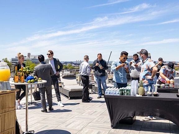 Private terraceRooftop deckCustom made cabinetsSleek italian designButcher block countertopsKitchenette with stainless-steel appliances